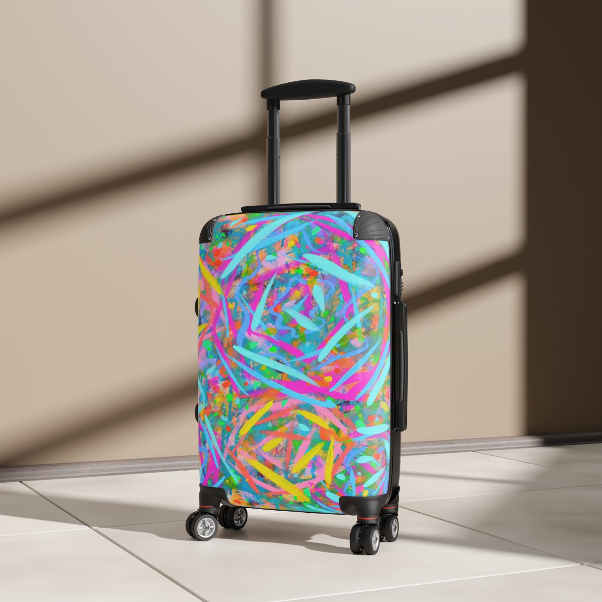 Bright, energetic hard-shell luggage that turns travel into a statement. Lightweight polycarbonate front and ABS back protect your gear while a bold, abstract swirl print makes your suitcase instantly recognizable on the carousel. Inside, organized packing is easy with two inner pockets and a removable lining under a rubber seal. Glide through terminals on four double 360° wheels and adjust the telescopic handle to your stride. The largest size offers expandable capacity and a built-in lock keeps belongings secure. This suitcase is for travelers who value durability and personality — whether you're hopping a weekend flight, navigating city streets, or packing for a colorful escape.